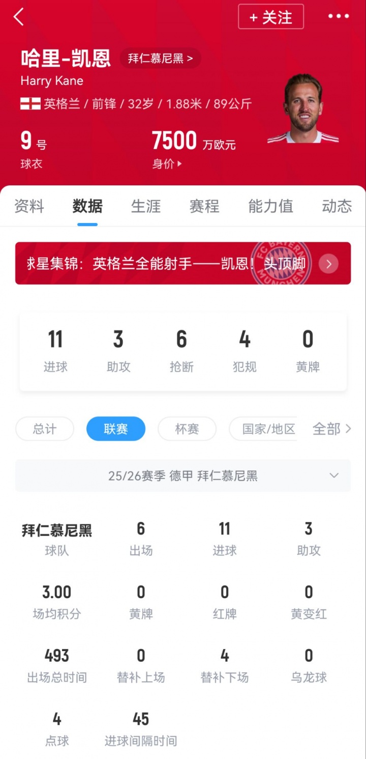 本赛季开赛以来凯恩状态极为火热,为拜仁在联赛中出场6次,贡献11球3助。目前32岁的凯恩身价为7500万欧元。
